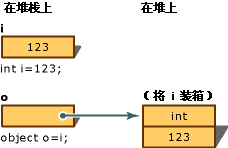 此语句的结果是在堆栈上创建对象引用 o,而在堆上则引用 int 类型的值。该值是赋给变量 i 的值类型值的一个副本。下图说明了两个变量 io 之间的差异。